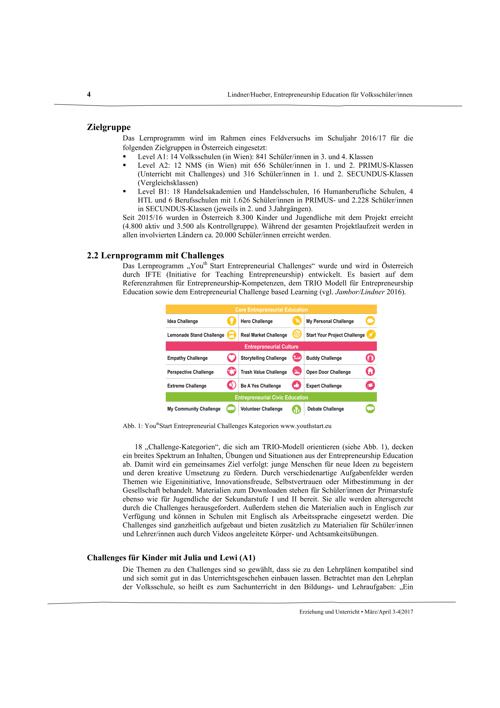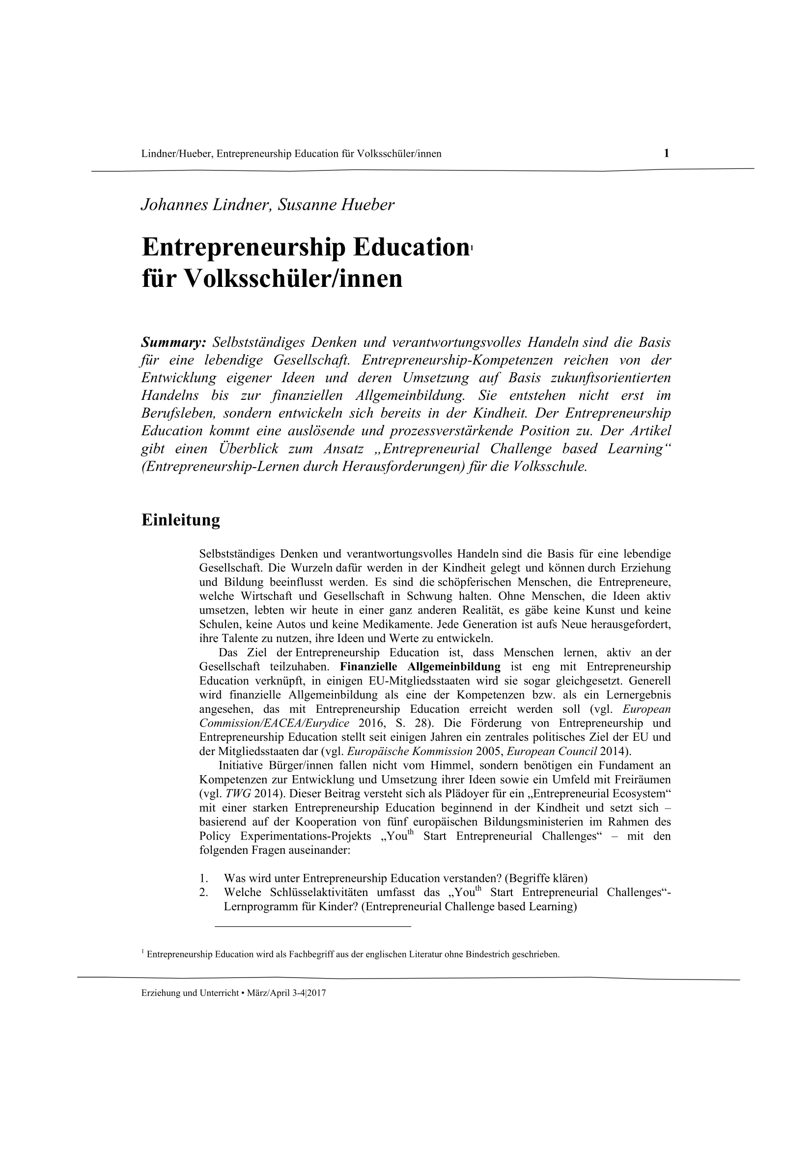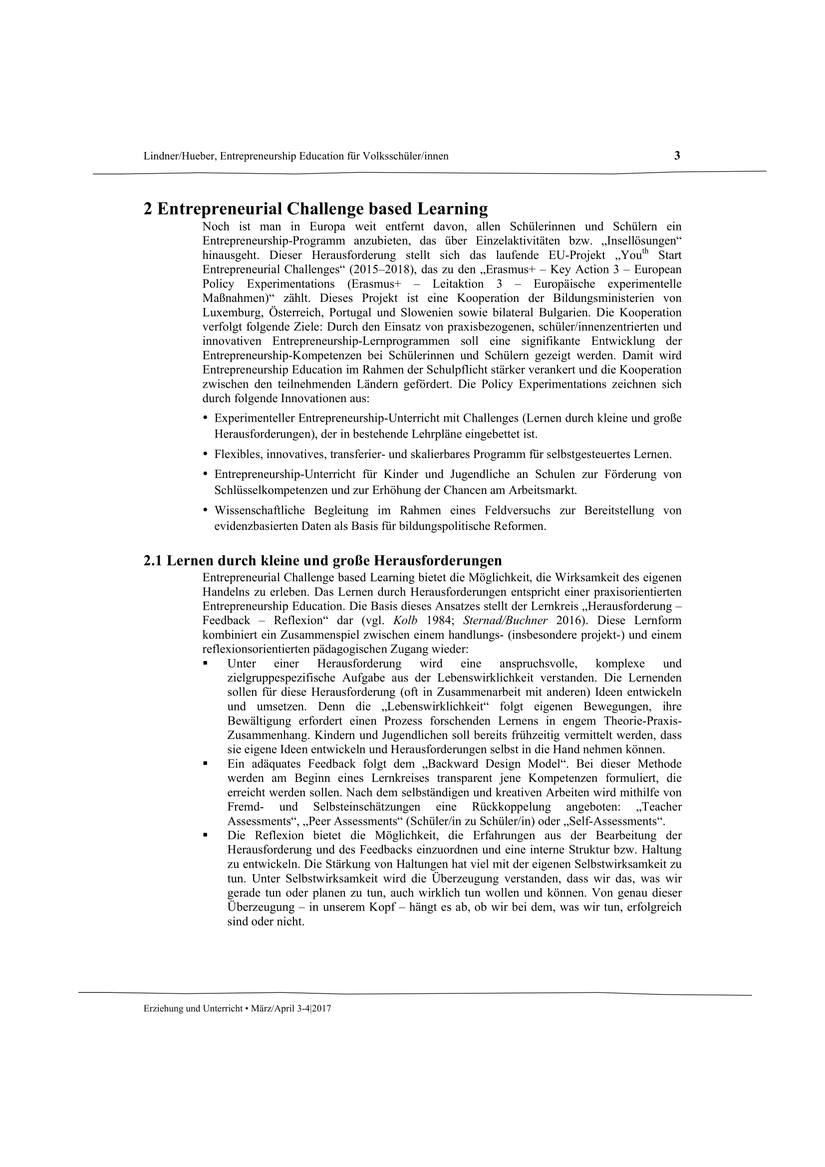 Independent thinking and responsible action are the basis for a vibrant society. Entrepreneurship skills range from the development of one's own ideas and their implementation on the basis of future-oriented action to general financial education. They do not just emerge in professional life, but develop as early as childhood. Entrepreneurship education plays a triggering and process-reinforcing role. The article provides an overview of the “Entrepreneurial Challenge-based Learning” approach for elementary school.