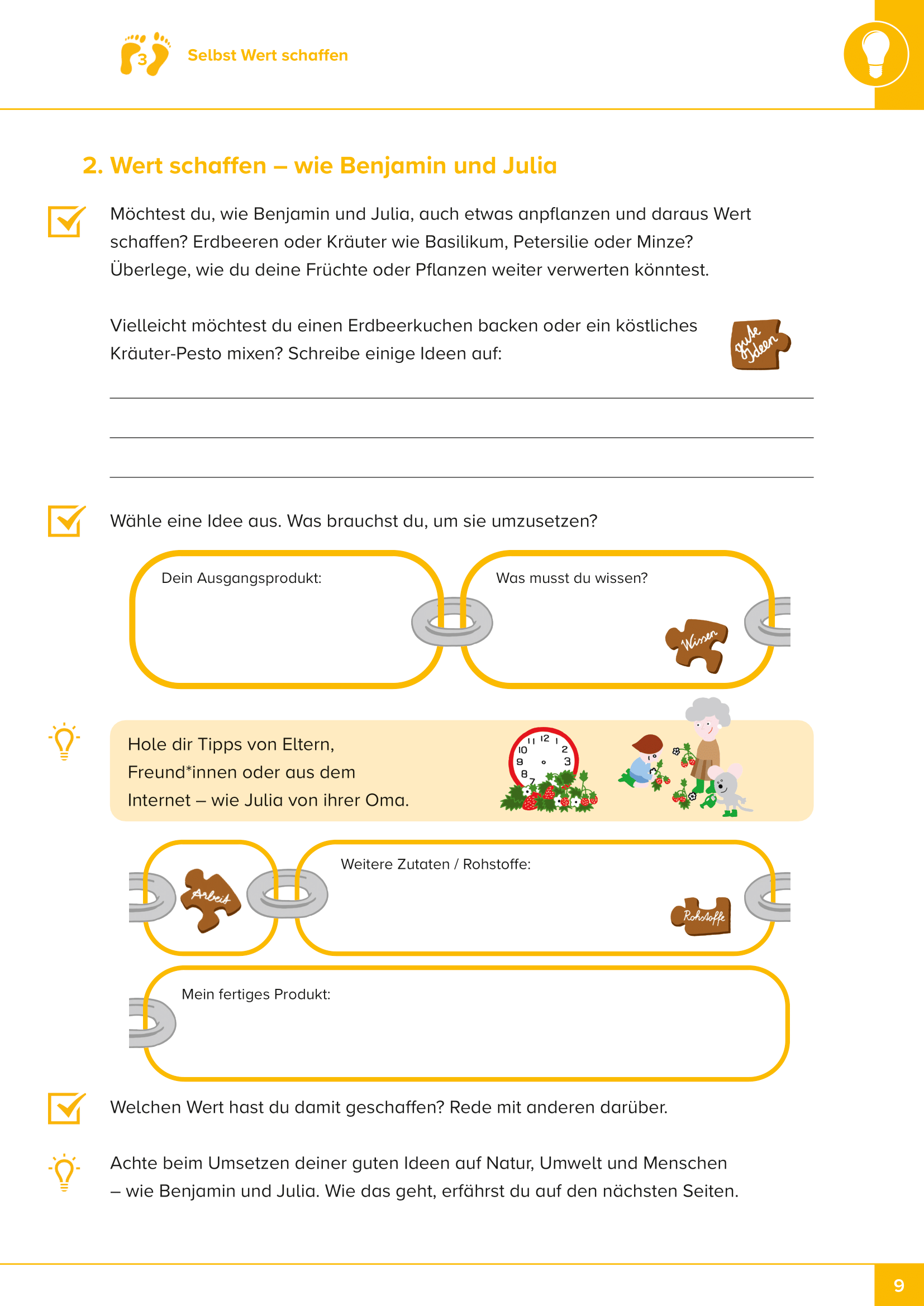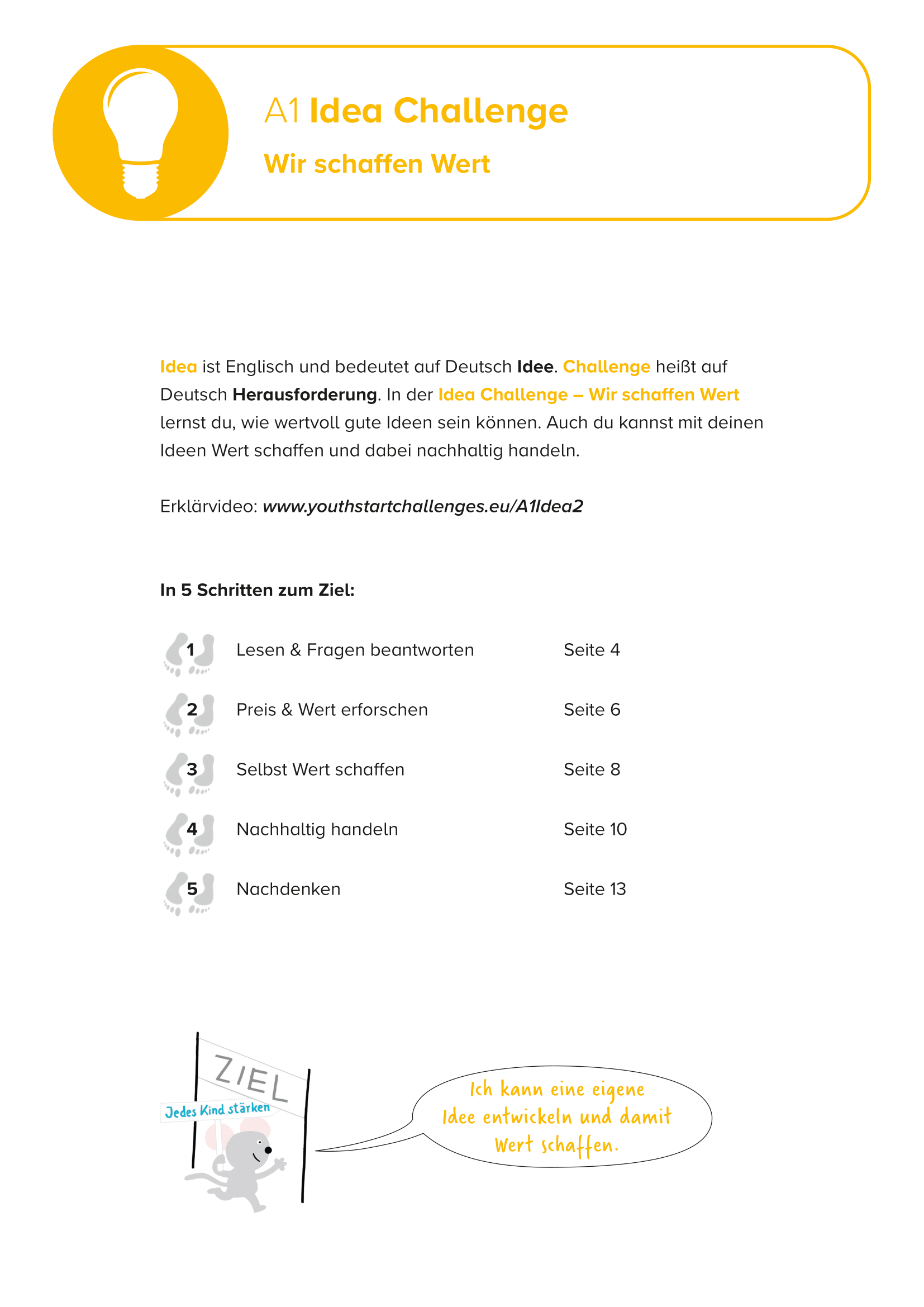Die Kinder lernen, wie sie mit guten Ideen Wert schaffen und dabei nachhaltig handeln (‚Wir schaffen Wert‘). Gemeinsam wird ein erstes Verkaufserlebnis geplant - von der Produkt- oder Dienstleistungswahl bis zum Verkaufsgespräch am Markt-Tag (‚Verkaufen macht Spaß‘).