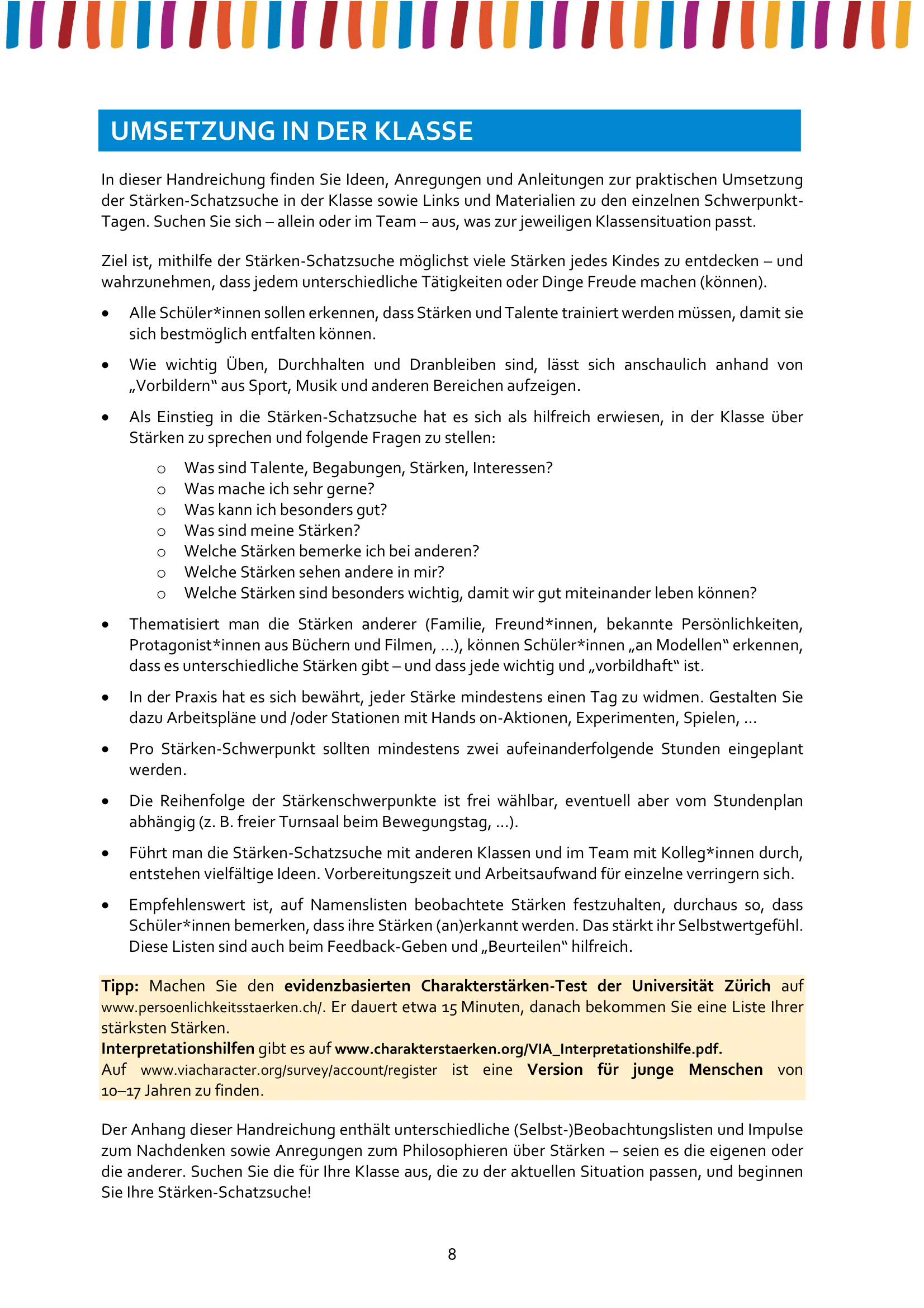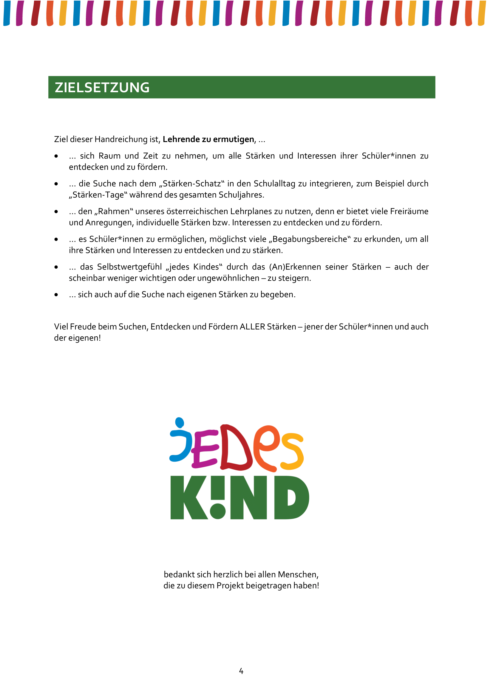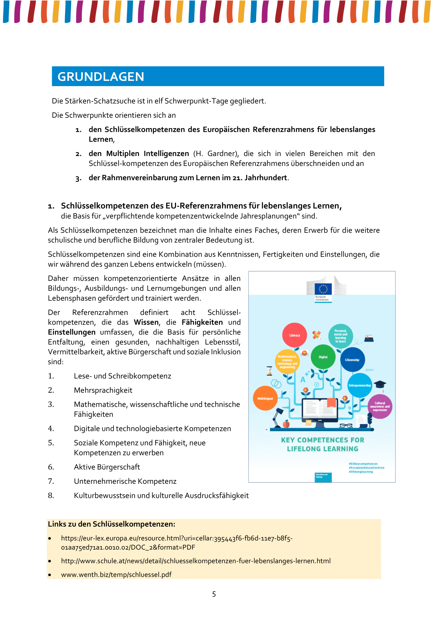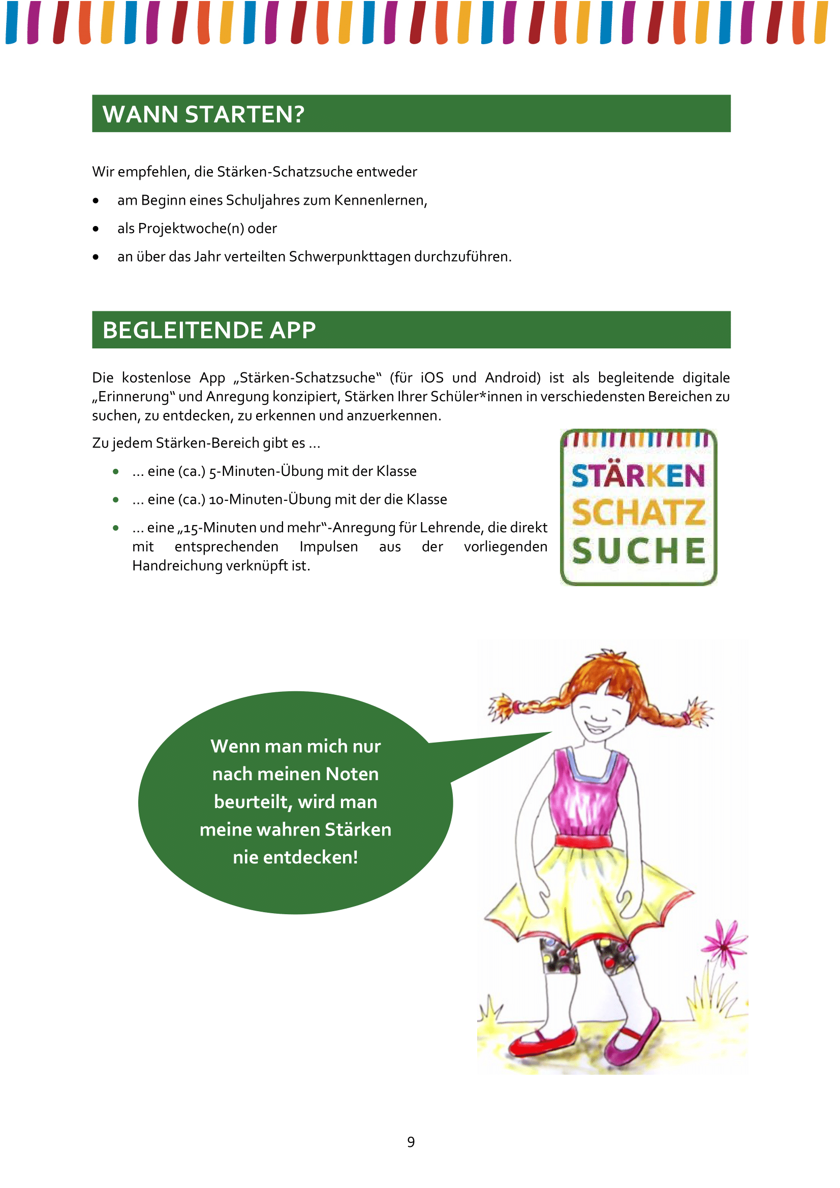 Ziel der Stärken-Schatzsuche ist, Lehrende zu ermutigen, sich Zeit zu nehmen, um alle Stärken und Interessen ihrer Schüler*innen zu entdecken und zu fördern. Die Stärken-Schatzsuche ist in 11 Schwerpunkt-Tage gegliedert, die sich an den Schlüsselkompetenzen des Europäischen Referenzrahmens für lebenslanges Lernen, den Multiplen Intelligenzen nach Gardner und an der Rahmenvereinbarung zum Lernen im 21. Jahrhundert orientiert. Die Stärken-Schatzsuche klassenübergreifend in den Schulalltag integrieren (z.B. durch „Stärken-Tage“ während des gesamten Schuljahres) und gemeinsam Stärken stärken!