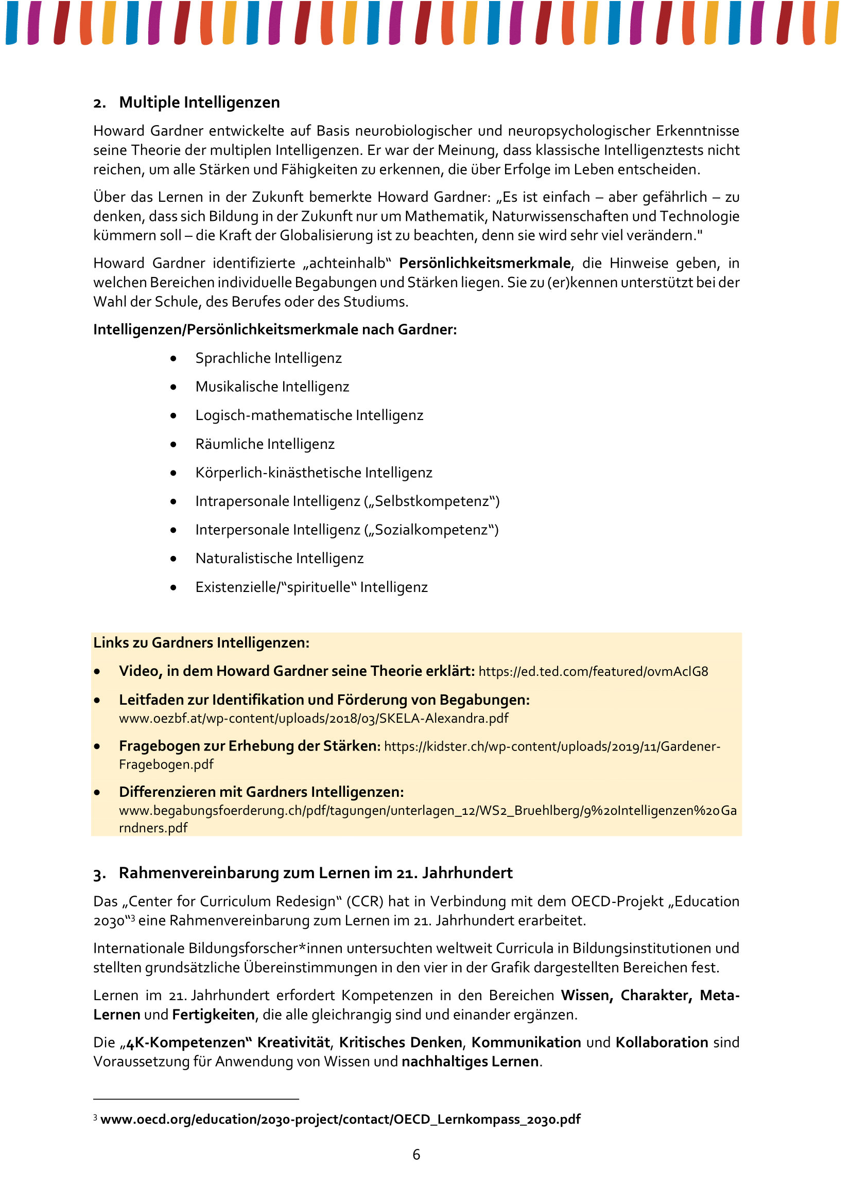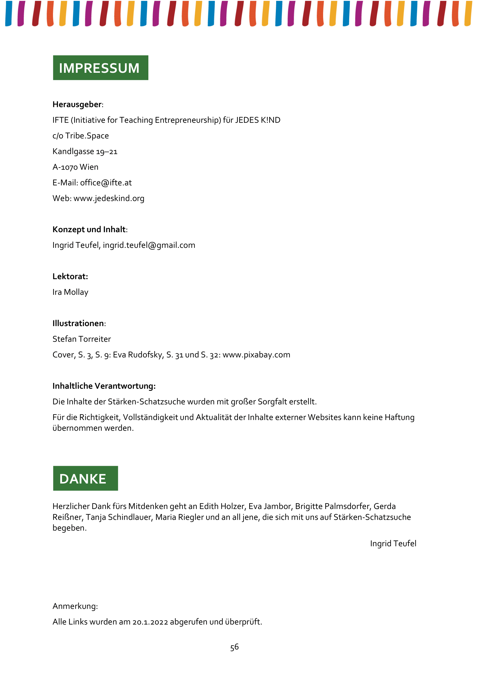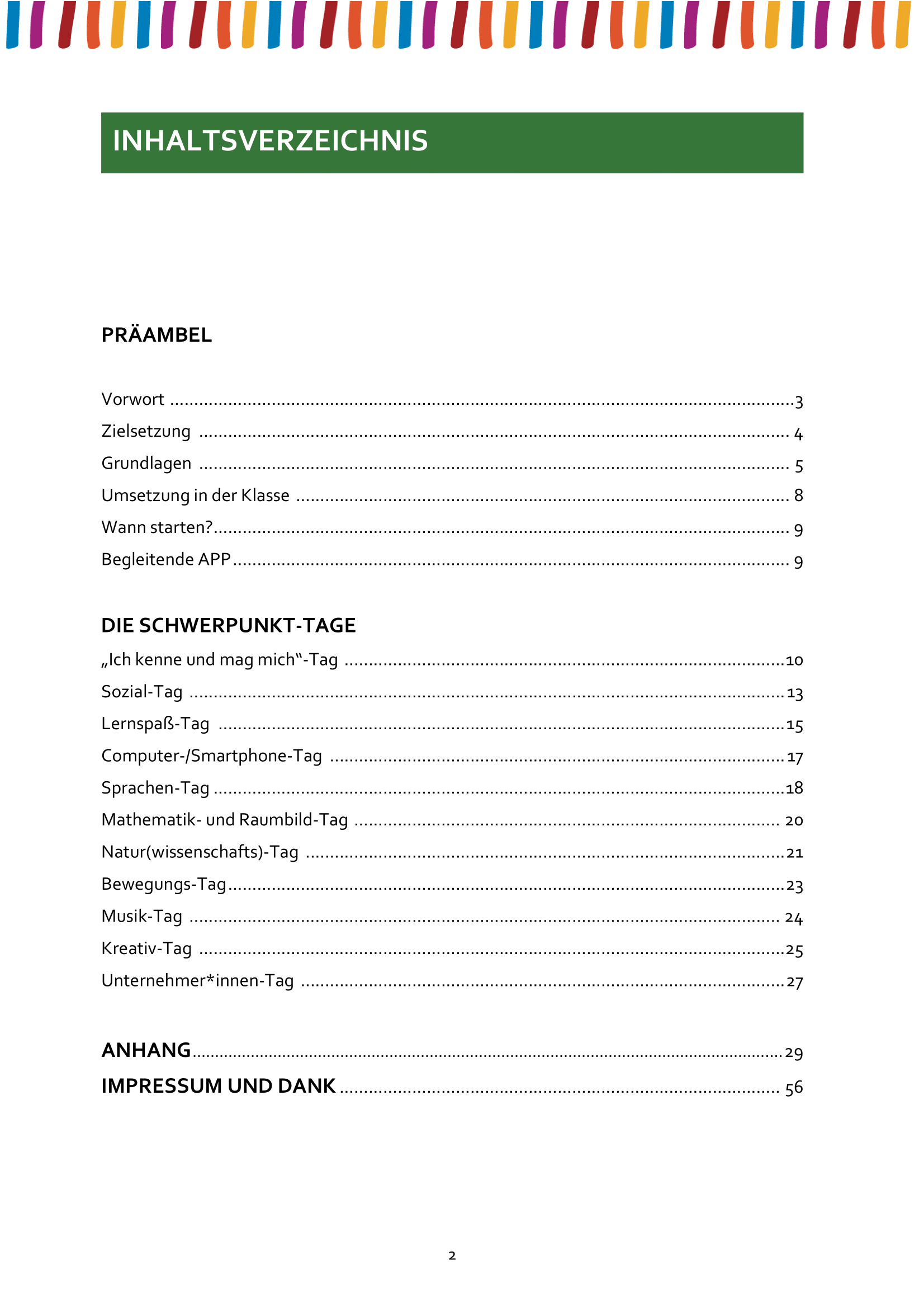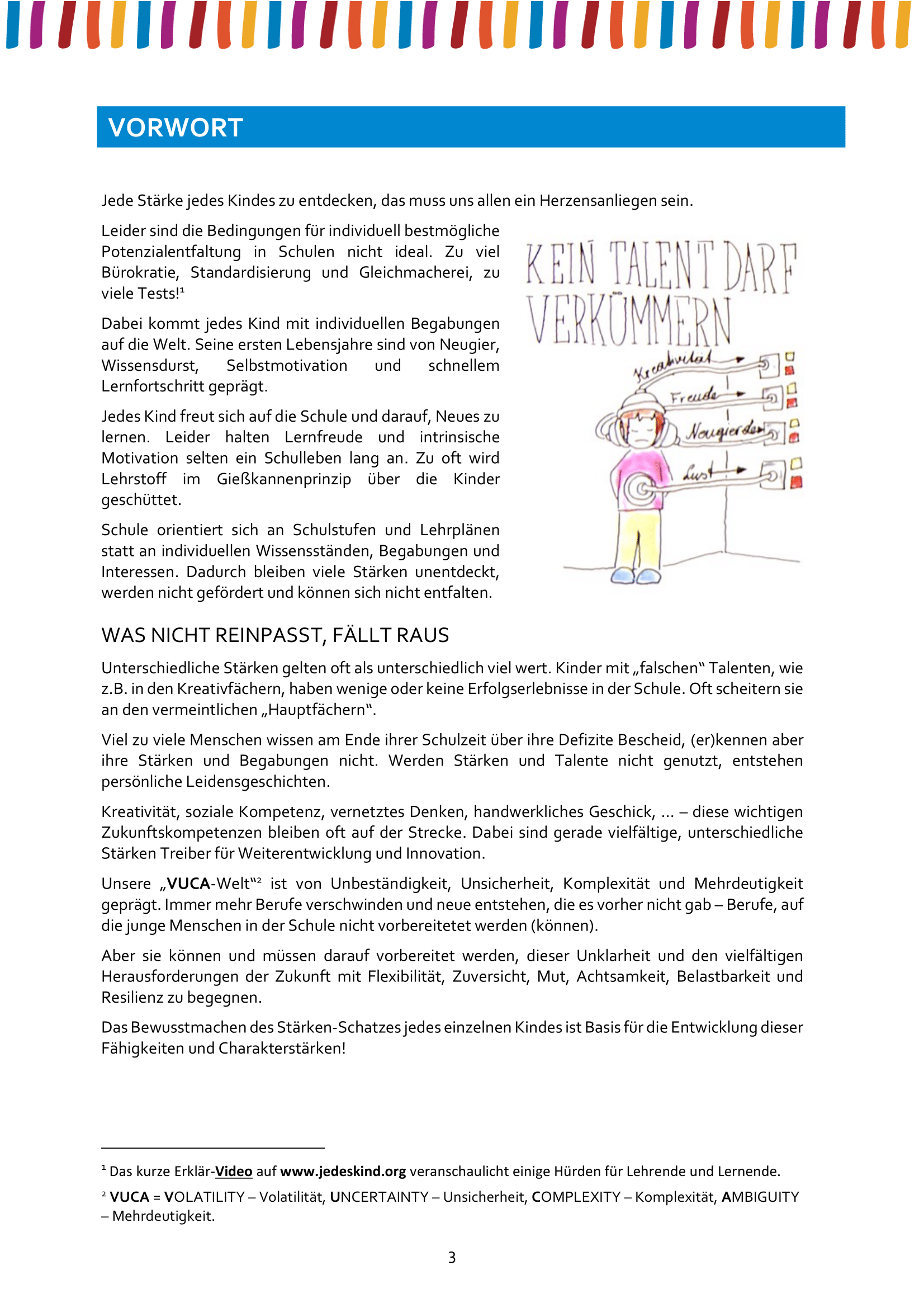 Ziel der Stärken-Schatzsuche ist, Lehrende zu ermutigen, sich Zeit zu nehmen, um alle Stärken und Interessen ihrer Schüler*innen zu entdecken und zu fördern. Die Stärken-Schatzsuche ist in 11 Schwerpunkt-Tage gegliedert, die sich an den Schlüsselkompetenzen des Europäischen Referenzrahmens für lebenslanges Lernen, den Multiplen Intelligenzen nach Gardner und an der Rahmenvereinbarung zum Lernen im 21. Jahrhundert orientiert. Die Stärken-Schatzsuche klassenübergreifend in den Schulalltag integrieren (z.B. durch „Stärken-Tage“ während des gesamten Schuljahres) und gemeinsam Stärken stärken!